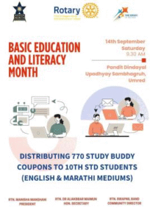 • In celebration of Rotary’s Basic Education and Literacy Month (September), we successfully distributed 770 Ideal Study App coupons to 10th standard Marathi medium students at Pandit Dindayal Upadhyay Sabhagruh, Umrer.